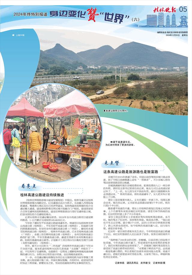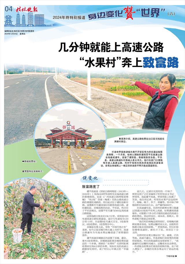 几分钟就能上高速公路 “水果村”奔上致富路   打造世界级旅游城市离不开坚实有力的交通运输服务保障。一个月前,桂林人期盼的灌阳至平乐高速公路全线建成通车,连接了灌阳县、恭城瑶族自治县、平乐县。高速公路通车对恭城人意义非凡,他们在家门口便能驾车驶入高速公路,而对于桂林市民和其他地区的游客来说,自驾去恭城喝上一碗正宗的油茶不再只能走国道前往。