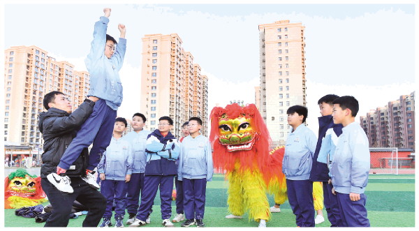 12月20日,河北省沧州市重庆路小学舞龙舞狮社团的学生们在舞狮艺人的指导下学习舞狮动作。