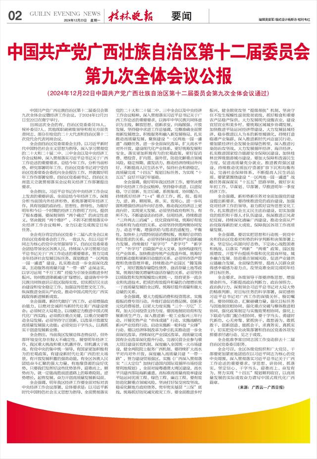 中国共产党广西壮族自治区第十二届委员会第九次全体会议暨经济工作会议,于2024年12月21日至22日在南宁举行。