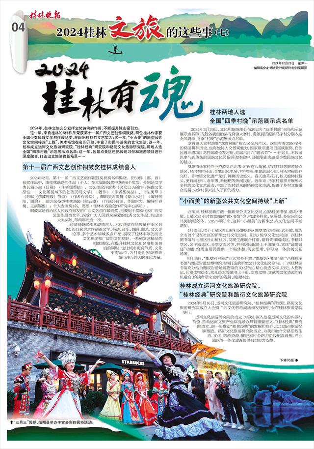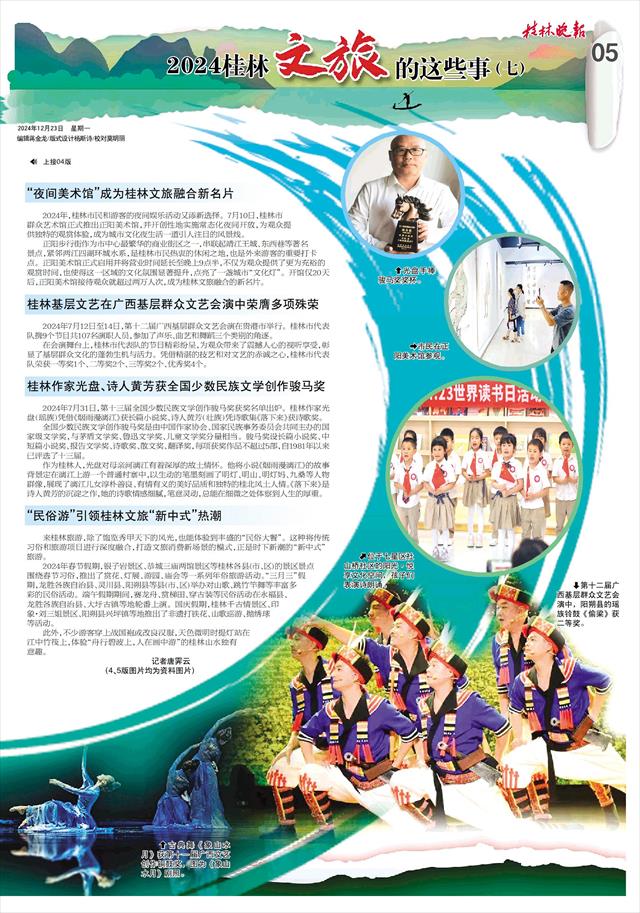 这一年,来自桂林的6件作品荣获第十一届广西文艺创作铜鼓奖、两位桂林作家获全国少数民族文学创作骏马奖,展现出桂林的文艺实力;这一年,“小而美”的新型公共文化空间接连“上线”,美术场馆在夜间开放,丰富了市民与游客的文化生活;这一年,桂林成立运河文化旅游研究院、“桂林经典”研究院和路衍文化旅游研究院,两地入选全国“四季村晚”示范展示点名单;这一年,各景点景区还把传统习俗和旅游项目进行深度融合,打造出文旅消费新场景……