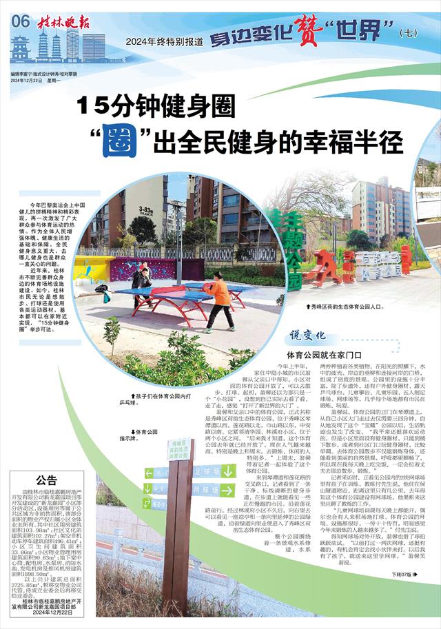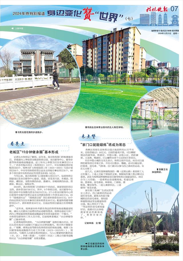 近年来,桂林市不断完善群众身边的体育场地设施建设。如今,桂林市民无论是想散步、打球还是使用各类运动器材,基本都可以在家附近实现,“15分钟健身圈”举步可达。