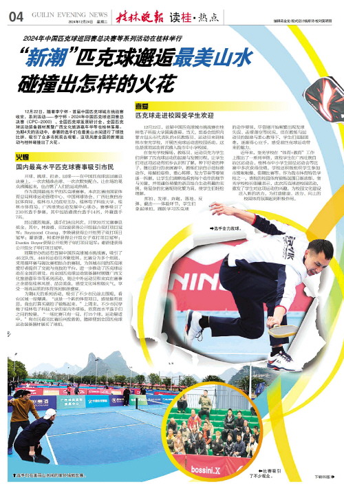 碰撞出怎样的火花   12月22日,随着李宁杯·首届中国匹克球城市挑战赛收官,系列活动——李宁杯·2024年中国匹克球巡回赛总决赛(CPC-2000)、全国匹克球发展研讨会、全国匹克球运动装备器材展暨广西文化旅游嘉年华等在桂林落幕。为期4天的活动中,参赛的选手们在最美山水间进行了球技比拼,吸引了众多市民前去观看。这项风靡全国的新潮运动与桂林碰撞出了火花。