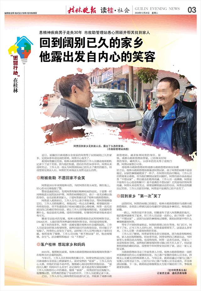 工作人员了解到,阿贵家里有众多兄弟姐妹,因为他患有精神疾病,家人也比较照顾他,但30多年前,阿贵突然自己离家出走,当时家里人全部出动去找他,也没有找到。阿贵一走杳无音讯,但家人一直没有放弃寻找,虽然他们都觉得阿贵可能已经不在人世了,但还是想找到他的确切消息。没想到今年阿贵安全回到了家,这让一家人又惊又喜。