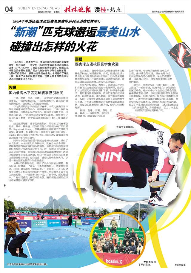 12月22日,随着李宁杯·首届中国匹克球城市挑战赛收官,系列活动——李宁杯·2024年中国匹克球巡回赛总决赛、全国匹克球发展研讨会、全国匹克球运动装备器材展暨广西文化旅游嘉年华等在桂林落幕。为期4天的活动中,这项风靡全国的新潮运动与桂林碰撞出了火花。