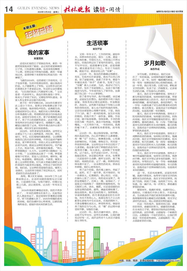 我呢,整天忙忙碌碌,2024年工作上还算说得过去,业余时间就给报纸写点豆腐块。只是感悟不深,写得不够好,但偶尔也能上几篇,这让我觉得,过去的一年充实又快乐。