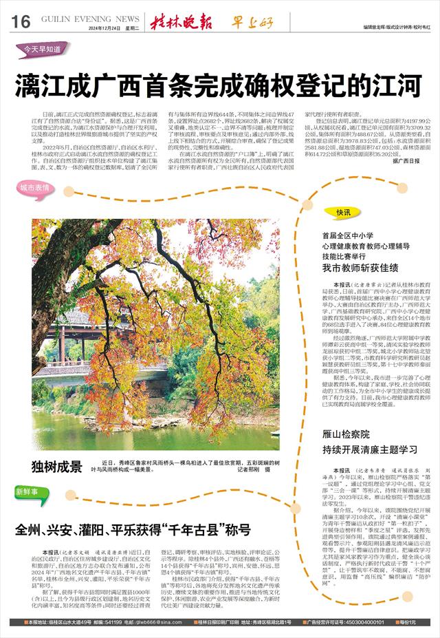 漓江成广西首条完成确权登记的江河   日前,漓江正式完成自然资源确权登记,标志着漓江有了自然资源合法“身份证”。据悉,这是广西首条完成登记的水流,为漓江水资源保护与合理开发利用,以及推动打造桂林世界级旅游城市提供了坚实的产权支撑。