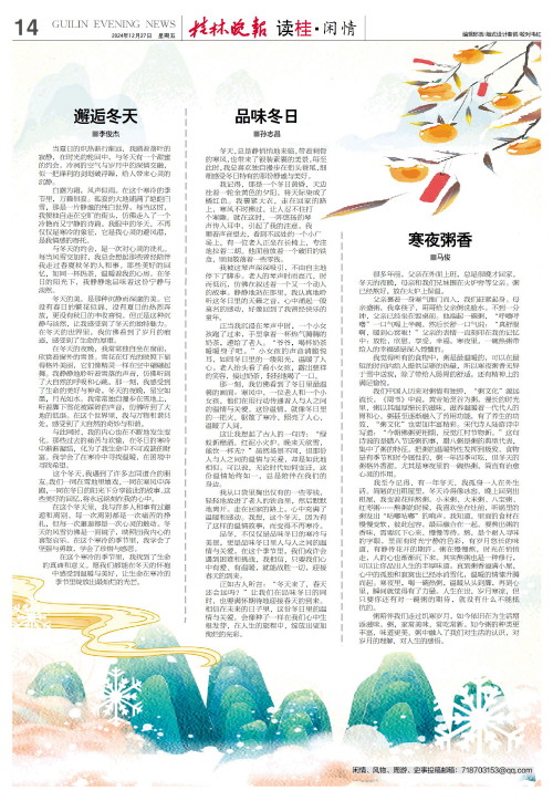 我从口袋里掏出仅有的一些零钱,轻轻地放进了老人的铁盒里,然后默默地离开。走在回家的路上,心中充满了温暖和感动。我想,这个冬天,因为有了这样的温情故事,而变得不再寒冷。 品冬,不仅仅是品味冬日的寒冷与美景,更是品味冬日里人与人之间的温情与关爱。在这个季节里,我们或许会遇到困难和挑战,我相信,只要我们心中有爱、有温暖,就能战胜一切,迎接春天的到来。