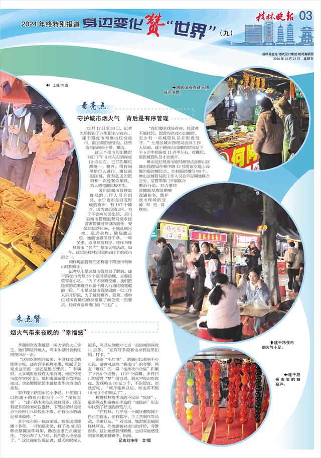 “在桂林,几乎每一个城区都有属于自己的夜市,还有歌圩、手工艺制作等活动,非常好玩。”刘贝说,她时常会刷到桂林网友、外地游客对夜市的评价,夸赞很多。这让她感到很骄傲,也切实地感受到家乡越来越繁华、热闹。