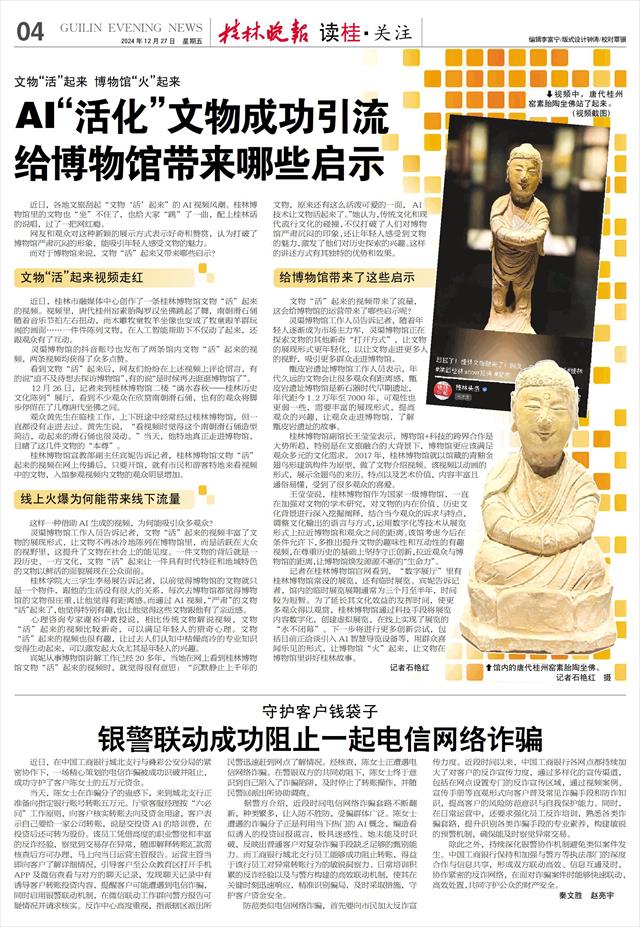桂林博物馆宣教部副主任宾妮告诉记者,桂林博物馆文物“活”起来的视频在网上传播后,只要开馆,就有市民和游客特地来看视频中的文物,入馆参观视频内文物的观众明显增加。