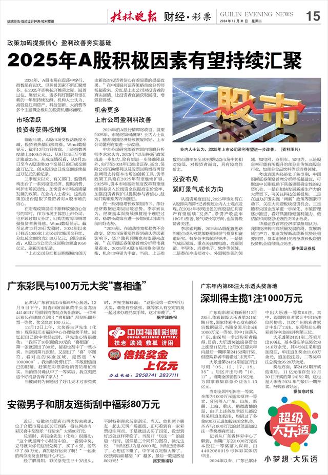 政策加码提振信心 盈利改善夯实基础 2025年A股积极因素有望持续汇聚   2024年,A股市场在震荡中穿行,指数虽有起伏,但积极因素不断汇聚增多。在2025年即将拉开帷幕之际,回首过往、展望未来,诸多利好因素有望在新的一年里持续发酵。机构人士认为,高股息红利资产、科技创新、大消费等多个主题概念板块的投资机遇将涌现。