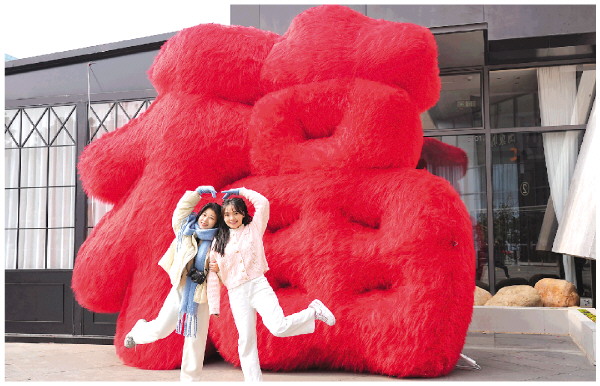 昨日中午,市民小谢(左)和闺蜜在市区一商场的大福字前摆出可爱姿势拍照,共同祈愿新的一年里福气多多,好运连连。