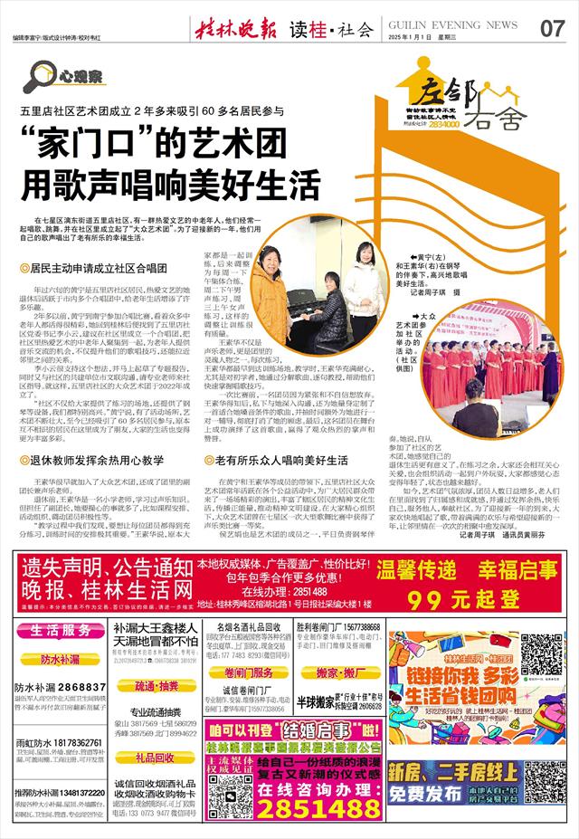 在七星区漓东街道五里店社区,有一群热爱文艺的中老年人,他们经常一起唱歌、跳舞,并在社区里成立起了“大众艺术团”。为了迎接新的一年,他们用自己的歌声唱出了老有所乐的幸福生活。