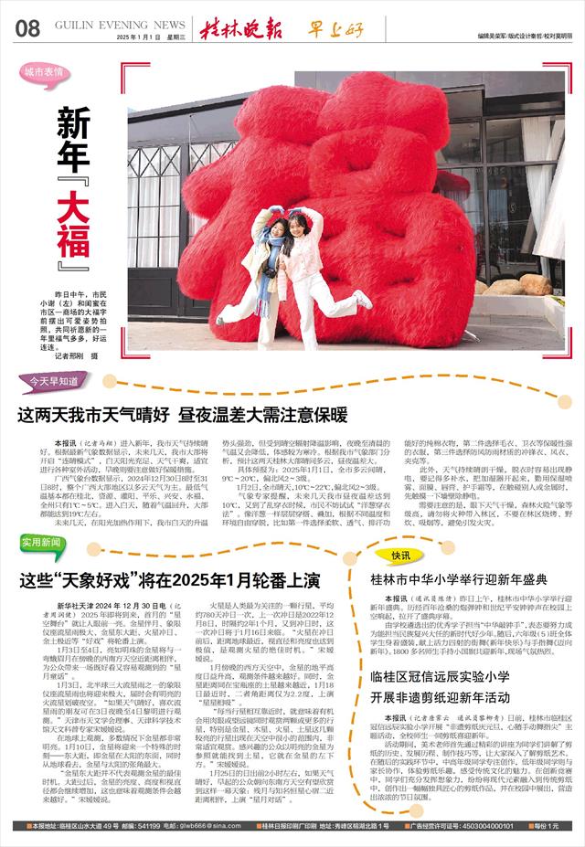本报讯(记者唐霁云 通讯员黎柳青)日前,桂林市临桂区冠信远辰实验小学开展“非遗剪纸庆元旦,心随手动舞指尖”主题活动,全校师生一同剪纸喜迎新年。