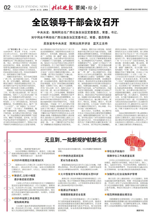 《广西日报》讯(广西云-广西日报记者陈贻泽 龚文颖 罗昌亮 江宏坤)2024年12月31日,全区领导干部会议在南宁召开。中央组织部副部长兼干部二局局长吴浩同志出席会议并宣布中央决定:陈刚同志任广西壮族自治区党委委员、常委、书记,刘宁同志不再担任广西壮族自治区党委书记、常委、委员职务。自治区党委书记陈刚出席会议并讲话。自治区党委副书记、自治区主席蓝天立主持会议。自治区政协主席孙大伟,自治区党委副书记、组织部部长王维平出席。