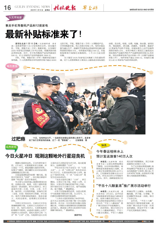 事关手机等数码产品和12类家电 最新补贴标准来了!   新华社北京1月15日电(记者谢希瑶 唐诗凝)商务部等部门15日发布两份文件,对实施手机、平板、智能手表(手环)购新补贴,以及做好2025年家电以旧换新工作予以安排,明确具体补贴品类和标准。其中,买手机等数码产品每件最高补500元,买12类家电产品每件最高补2000元。