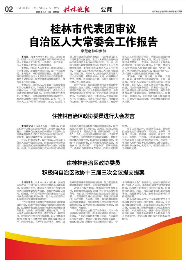 赵仲华表示,报告通篇贯彻习近平新时代中国特色社会主义思想,特别是习近平总书记关于坚持和完善人民代表大会制度的重要思想,全面贯彻落实习近平总书记关于广西工作论述的重要要求,充分展现了过去一年自治区人大常委会服务中心有为有位、代表工作有声有色、自身建设有力有效,是一个主题鲜明、求真务实、充分彰显人大工作特点的好报告。该报告突出党的全面领导,突出紧扣中心大局,突出守正创新,突出求真务实。一直以来,自治区人大常委会高度重视、支持和关心桂林人大工作。桂林市人大将全面深入贯彻落实自治区“两会”精神,坚持围绕中心服务大局,依法行使职权,为打造桂林世界级旅游城市贡献力量。