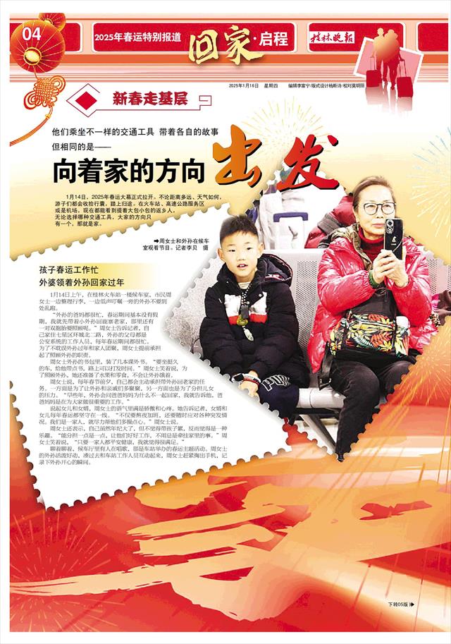 “外孙的爸妈都很忙,春运期间基本没有假期,我就先带着小外孙回鹿寨老家,那里还有一对双胞胎要照顾呢。”周女士告诉记者,自己家住七星区环城北二路,外孙的父母都是公安系统的工作人员,每年春运期间都很忙。为了不耽误外孙过年和家人团聚,周女士提前承担起了照顾外孙的职责。