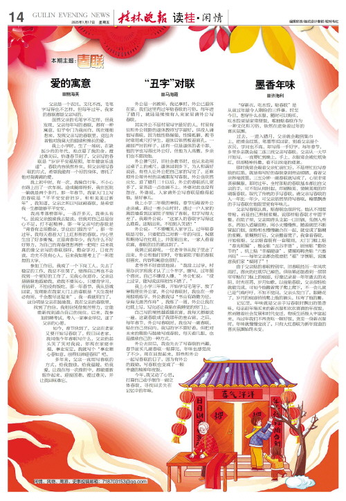 由于父亲贴的春联特别牢,旧春联经历一年风吹雨打,喜庆的红纸早已褪色,但依稀还能看到一层层牢牢粘在门框上的痕迹,好像记录着一年年逝去的光阴。时光荏苒,岁月如歌,以前贴春联,父亲很轻松就能完成,可如今他搬着凳子爬上爬下,不一会儿就已是气喘吁吁。不知不觉间,父亲头发白了,眼睛花了,岁月的痕迹悄悄爬上他的额头,压弯了他的腰。