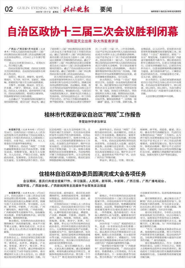 本报南宁讯(记者周文俊)1月16日上午,自治区政协十三届三次会议完成各项议程后胜利闭幕。会议期间,住桂林自治区政协委员认真履行职责,圆满完成了大会各项任务。学习强国、人民网、新华网、中新网、广西日报、广西广播电视台、南国早报、广西政协报、广西新闻网等主流媒体平台,纷纷聚焦采访报道,积极传递桂林声音,讲好桂林故事,展现桂林形象。