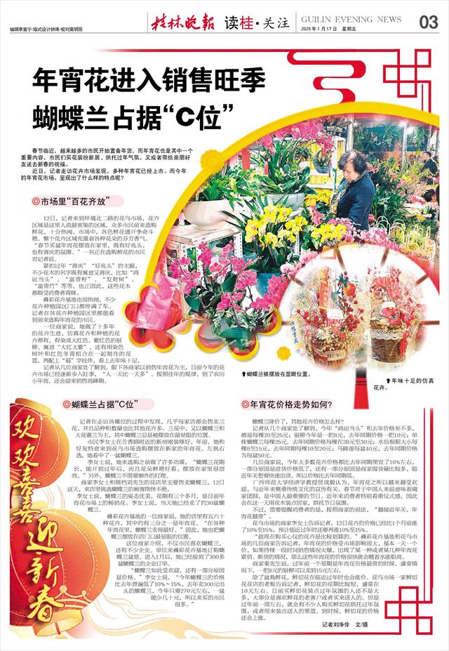 叠彩花卉基地的一位商家说,她的店里有五六十种花卉,其中约有三分之一是年宵花。“在各种年宵花里,蝴蝶兰卖得最好。”因此,她也把蝴蝶兰摆放在店门口最显眼的位置。