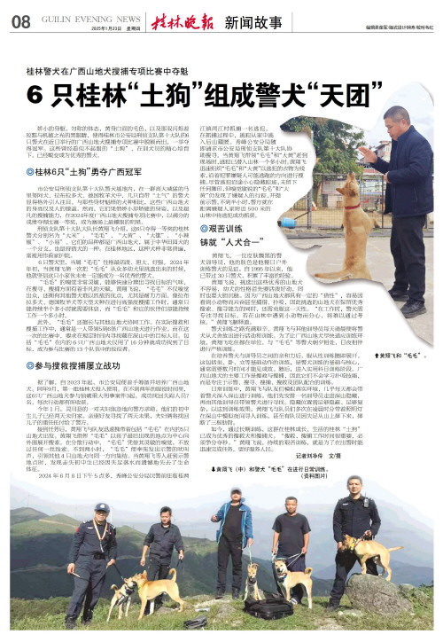 如今,通过长期训练,这群在桂林成长、生活的桂林“土狗”已成为优秀的搜救犬和搜捕犬。“搜救、搜捕工作时间很重要,必须争分夺秒。”黄翔飞说,持续的艰苦训练,就是为了在出警时能迅速完成任务,更好服务人民。
