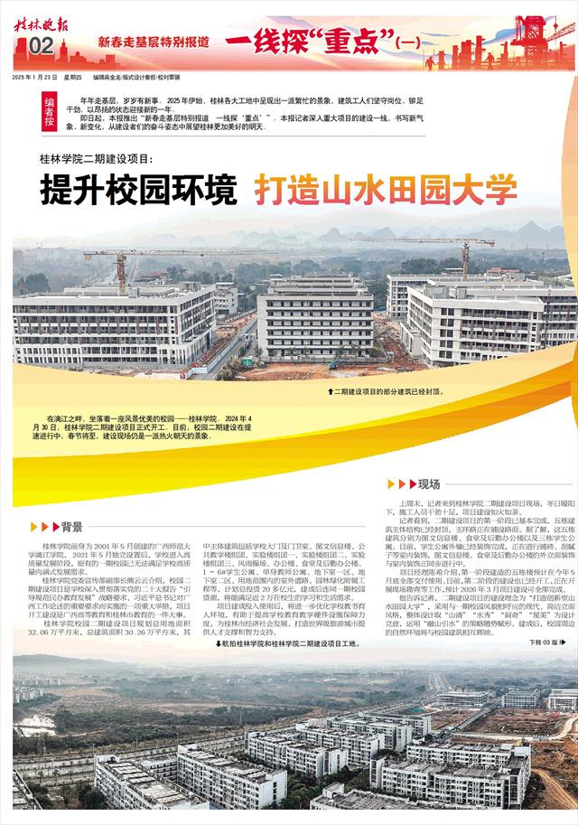 本报即日起推出“新春走基层特别报道 一线探‘重点’”,深入重大项目建设一线,探访项目进度与亮点。今天,记者带您走进桂林学院二期建设项目现场,看一看“打造山水田园大学”的火热场景。
