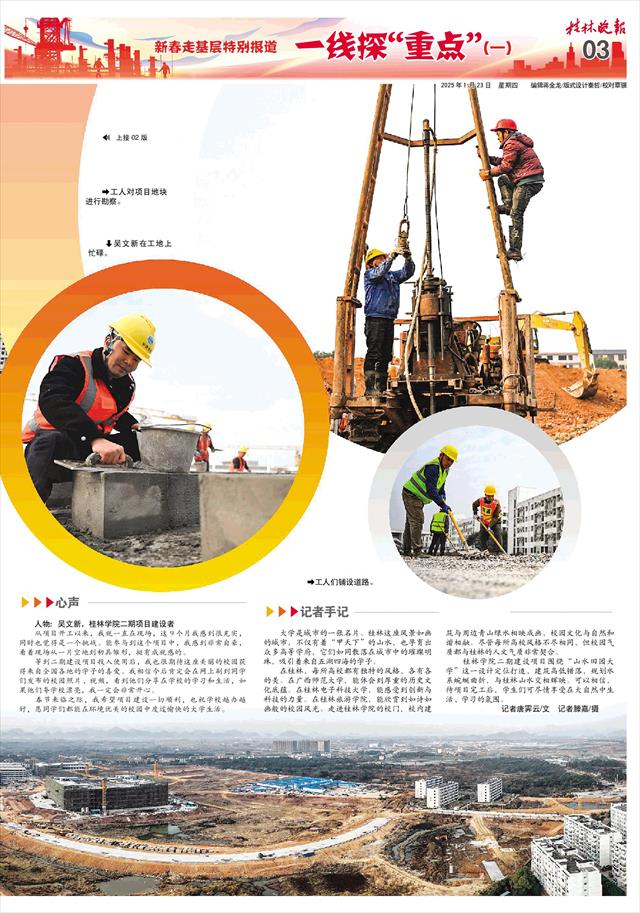 即日起,本报推出“新春走基层特别报道 一线探‘重点’”。本报记者深入重大项目的建设一线,书写新气象、新变化,从建设者们的奋斗姿态中展望桂林更加美好的明天。
