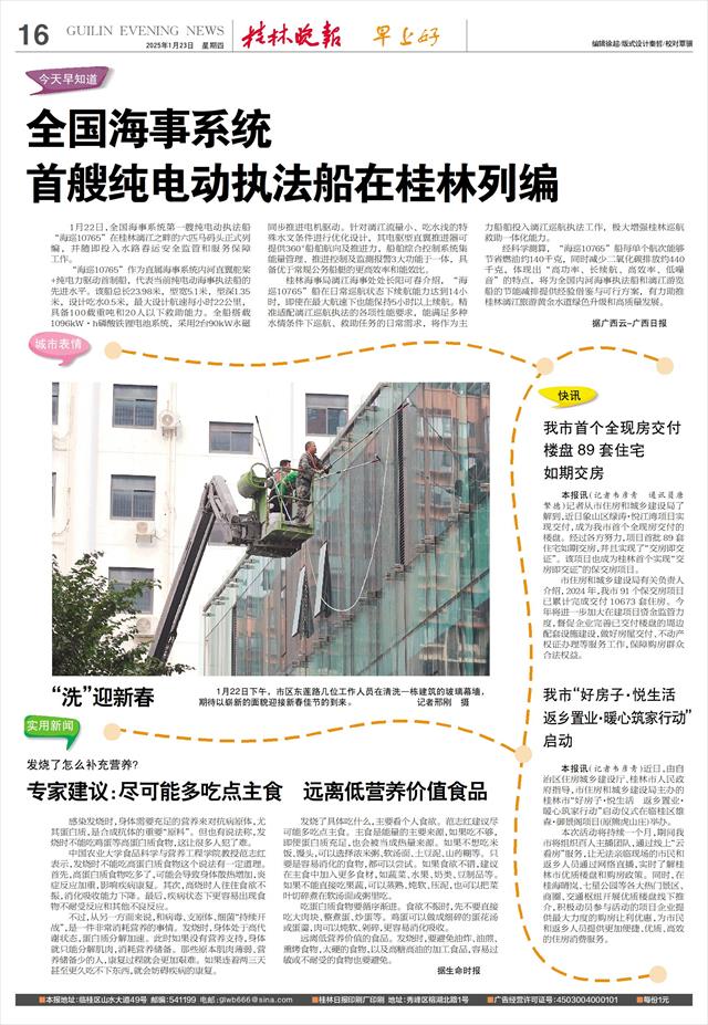 首艘纯电动执法船在桂林列编   1月22日,全国海事系统第一艘纯电动执法船“海巡10765”在桂林漓江之畔的六匹马码头正式列编,并随即投入水路春运安全监管和服务保障工作。