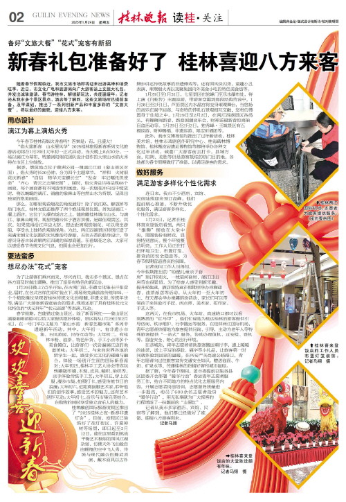 备好“文旅大餐” “花式”宠客有新招 新春礼包准备好了 桂林喜迎八方来客   随着春节假期临近,我市文旅市场即将迎来出游高峰和消费旺季。近日,市文化广电和旅游局向广大游客送上文旅大礼包,并发出诚挚邀请,春节游桂林,解锁新玩法,共度温暖年。记者还从我市多个景区景点、酒店等了解到,这些文旅场所已提前准备、及早谋划,推出了一系列创新产品和丰富多彩的“文旅大餐”,将以最好的面貌,迎接八方来客。
