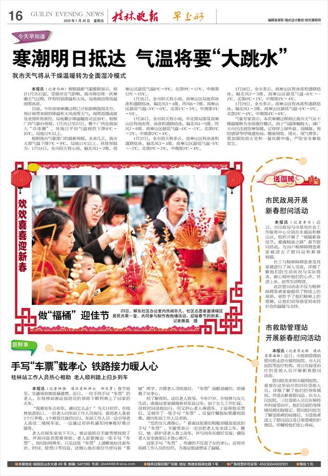 手写“车票”载孝心 铁路接力暖人心 桂林站工作人员热心相助 老人顺利踏上归乡列车   本报讯(记者林扬 通讯员林祥云 郑长贤)春节将至,交通场站客流量激增。近日,一位手持手写“车票”的老人,在桂林站客运值班员的帮助下顺利乘上了回家的火车。