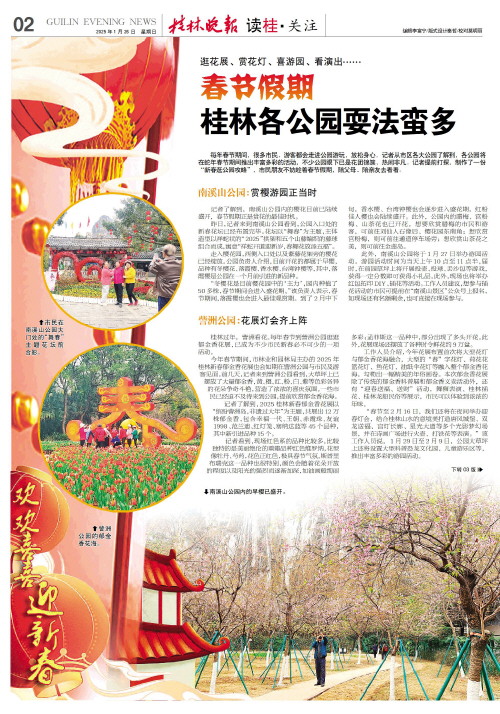 每年春节期间,很多市民、游客都会走进公园游玩,放松身心。记者从市区各大公园了解到,各公园将在蛇年春节期间推出丰富多彩的活动,不少公园眼下已是花团锦簇、热闹非凡。记者提前打探,制作了一份“新春逛公园攻略”,市民朋友不妨趁着春节假期,陪父母、陪亲友去看看。
