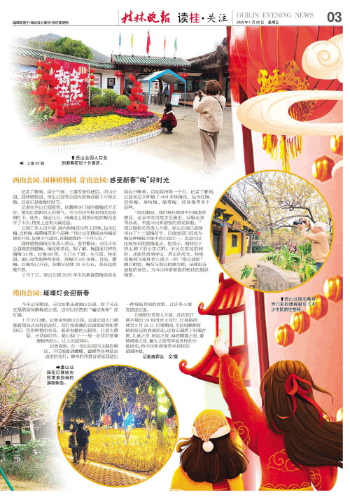 “活动期间,我们将在观景平台做造型摆花,还会举办百姓文艺演出、汉服走秀等活动,丰富市民和游客的赏花体验。”该公园相关负责人介绍,穿山公园已连续举办了十三届梅花节,目前该园已经成为梅花种植较为集中的公园之一,也是市区比较知名的赏梅地点。他表示,梅林位于穿山脚下的小东江畔,市民在赏花的同时,还能欣赏到穿山、塔山的风光。特别是梅林与桂林老八景之一的“塔山清影”隔江相望,梅花与塔山相映生辉,呈现出诗意般的景色,为市民和游客提供绝佳的摄影场景。