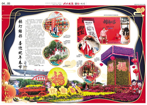临江路有多家酒店、民宿和咖啡店,早早就营造布置好了过年氛围。许先生在临江路开咖啡店已经有5年,1月9日就用红灯笼、红纸伞、红挂布、福袋等把店里店外装扮得喜气洋洋,一些市民还特意来打卡拍照。在龙珠路,记者看到一家酒店的大堂被红灯笼、红条幅、醒狮、鲤鱼花灯装扮得十分喜庆。市区的景区景点同样充满过年氛围,伏波山景区门口有“蛇贺新年 欢度佳节”的花坛,造型可爱的卡通蛇KT板放在花坛中,旁边树上还挂了红灯笼。