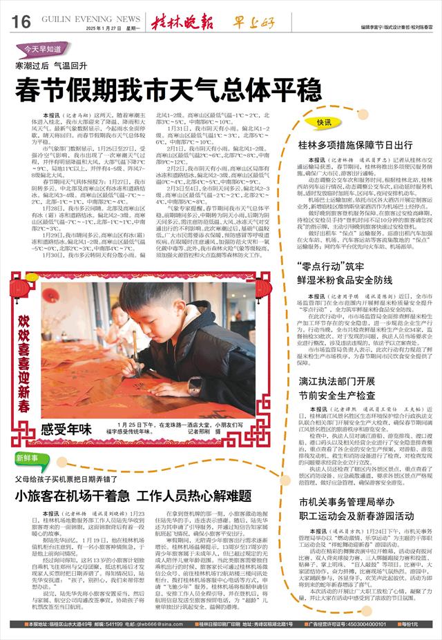 节前安全生产检查   本报讯(记者谭熙 通讯员王荣仕 王夫韬)近日,桂林漓江风景名胜区生态环境保护综合行政执法支队联合相关部门开展安全生产大检查,确保春节期间漓江风景名胜区的旅游秩序和游览安全。