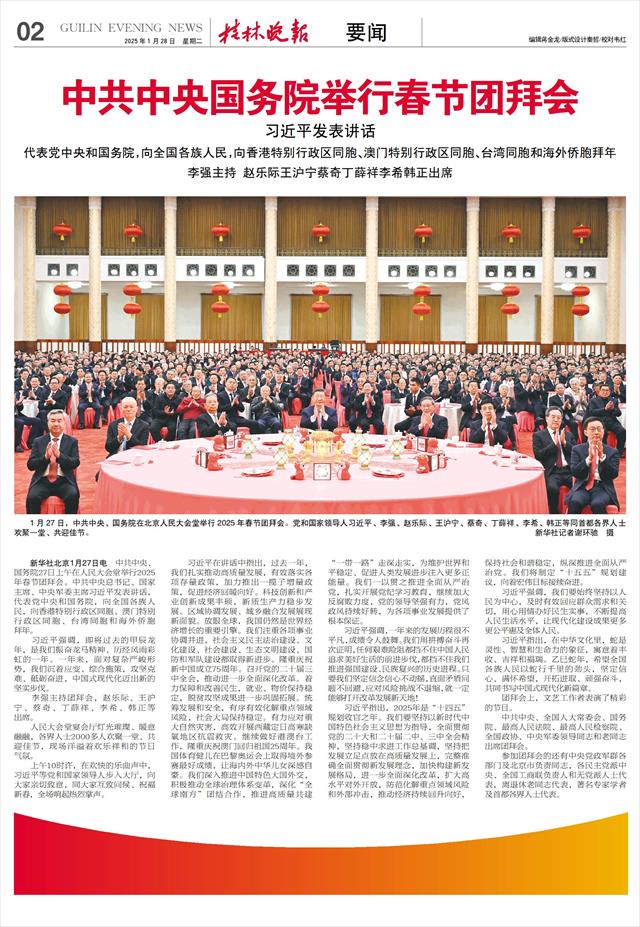 新华社北京1月27日电 中共中央、国务院27日上午在人民大会堂举行2025年春节团拜会。中共中央总书记、国家主席、中央军委主席习近平发表讲话,代表党中央和国务院,向全国各族人民,向香港特别行政区同胞、澳门特别行政区同胞、台湾同胞和海外侨胞拜年。