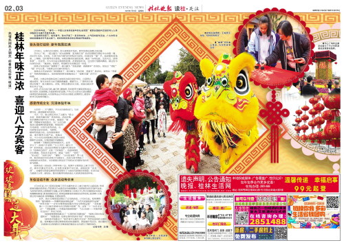 此外,在市区滨江路、漓江桥、解放桥、东西巷等主要街道和地点,张灯结彩、花团锦簇,洋溢着喜庆的氛围。户外LED大屏全天滚动播放桂林特色新春海报,市民游客走过不时回头观望,拍照留念,感受传统节日的韵味和魅力。
