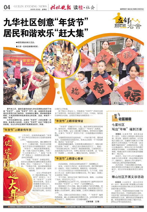 本报讯(记者周子琪 通讯员吴丽萍)近日,七星区七星街道七星社区党委、团支部、退役军人服务站、计生协联合龙隐小学、交通银行高新支行开展新时代文明实践站“中华民族一家亲 翰墨书廉树家风”志愿服务活动。七星社区邀请老年、青年以及少年书法爱好者现场书写春联。大家泼墨挥毫,以笔寄情,将廉洁家风与美好的新春祝福凝聚于一纸之间。