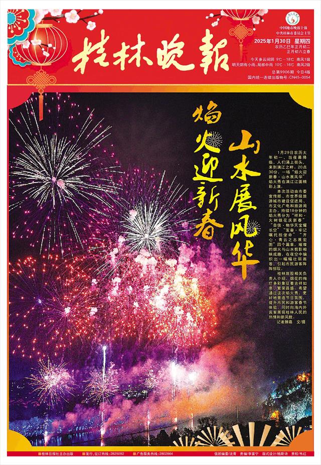1月29日农历大年初一,当夜幕降临,人们涌上街头,来到漓江之畔。20点30分,一场“焰火迎新春·山水展风华”焰火秀在漓江江面精彩上演。