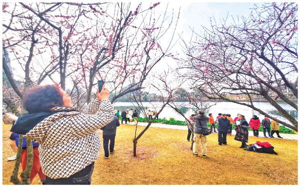 3日下午,在穿山公园里,游客趁着好天气来到这里赏花,把好看的梅花记录下来。记者滕嘉 摄