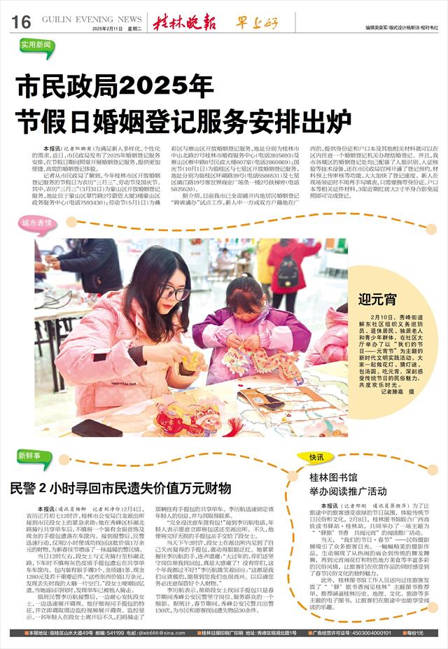 举办阅读推广活动   本报讯(记者邢刚 通讯员蒋颜萍)为了让旅途中的旅客感受浓厚的节日氛围,体验传统节日民俗和文化,2月8日,桂林图书馆联合广西高铁读书驿站·桂林站,共同举办了一场主题为“‘驿旅’书香 共阅元宵”的阅读推广活动。