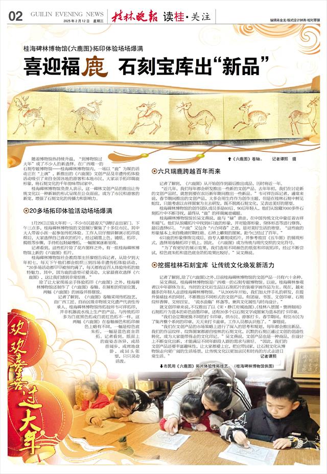随着博物馆热持续升温,“到博物馆过大年”成了不少人的新选择。在广西唯一的石刻专题博物馆——桂海碑林博物馆内,一场以“鹿”为媒的活动正在“上演”,新推出的《六鹿图》文创产品及非遗传拓体验活动吸引了来自全国各地的游客和本地市民,大家亲手拓印瑞鹿形象,将石刻文化的千年韵味带回家中。
