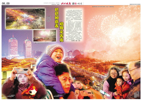 市民李先生表示,他和家人大年初一晚上在象鼻山观看了漓江烟火秀,元宵节晚上又在临桂新区欣赏了音乐烟花秀,这个春节让人印象深刻,“祝桂林发展越来越好,如烟花般绚丽多姿、活力满满”。