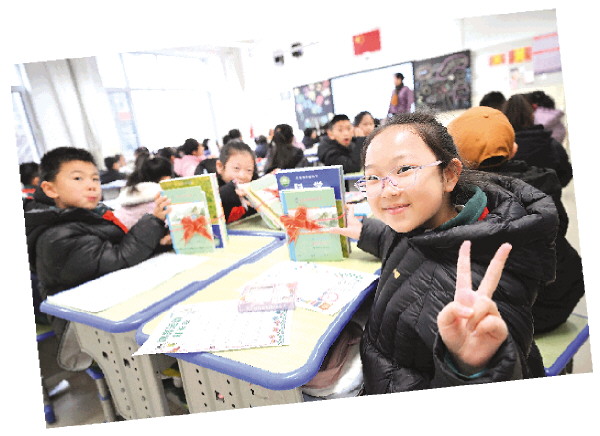 2月16日,宁夏银川市兴庆区实验二小学生在展示领到的新课本。新华社发