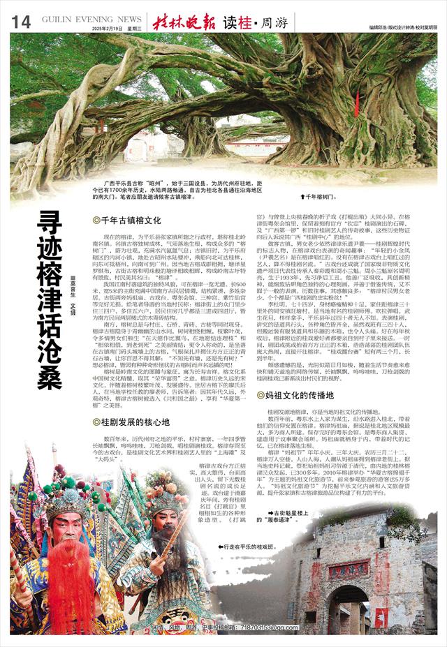数百年来,历代州府之地的平乐,村村寨寨,一年四季皆长袖飘飘,呜呜哇哇,刀枪剑戟,唱桂剧演桂戏。榕津存留至今的古戏台,是桂剧文化艺术界和桂剧艺人里的“上海滩”及“大码头”。