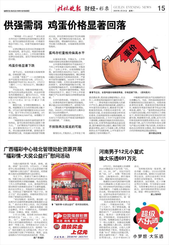 展望后市,王俊表示,上半年处于鸡蛋消费淡季,需求端支撑题材较少,在去年三、四季度鸡苗偏高补栏量的压制下,今年一、二季度鸡蛋市场面临较大的新开产压力,叠加老鸡延淘因素,或制约上半年蛋价的反弹动力。随着春节后第一轮备货的结束,不排除未来蛋价有二次探底的可能。在卓创资讯鸡蛋分析师刘宏看来,目前鸡蛋现货市场购销疲弱,市场仍处探底阶段,2月中下旬蛋价仍有下滑预期。而随着价格跌至阶段性低位,批发市场、冷库等终端消费或会逐步改善,蛋价磨底阶段过渡后,叠加节假日因素逐步增加,或在3月逐渐上移,但考虑到供应水平因素影响,上半年蛋价水平或略低于往年同期水平。