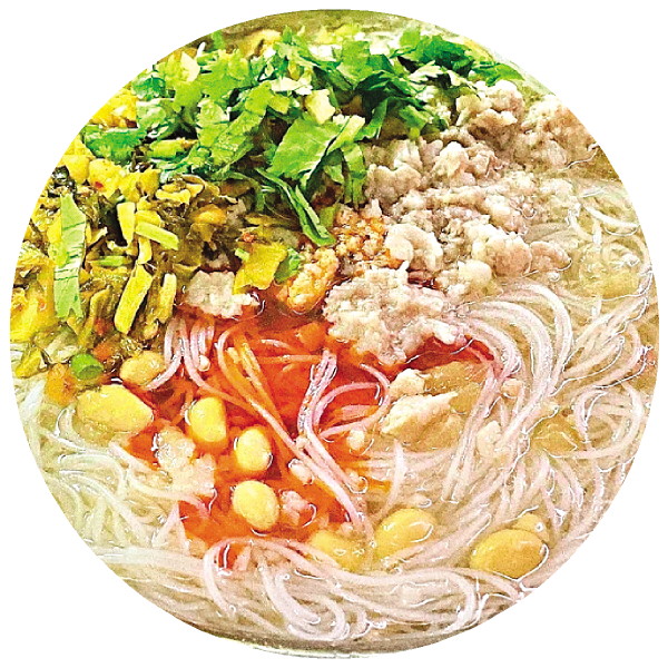 “老板,来二两红油米粉。”来得早不如来得巧,记者幸运地赶上了最新榨出来的米粉。刚榨好的米粉被老板娘用篮子分装没多久,就来到了记者的碗里。只见老板先后从三口锅里舀出肉末、黄豆和肉汤,麻利地浇在洁白的米粉上,一碗热气腾腾的米粉“胚子”就做好了。食客从一旁的小料台加上葱花、香菜,再淋一勺红彤彤的红油,这碗现榨红油米粉才算正式完成。