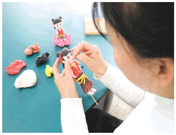 2月20日,泥塑艺人杨爱华在山东省滨州市的一所小学创作哪吒主题泥塑。