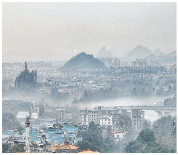 2日一早,桂林城升起一层淡淡薄雾,漓江桥附近呈现烟雨美景。记者使用无人机航拍记录下这一迷人景象。 记者滕嘉 摄