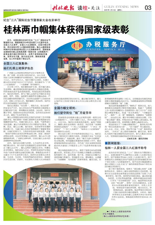 纪念“三八”国际妇女节暨表彰大会在京举行 桂林两巾帼集体获得国家级表彰   近日,全国妇联在京举行纪念“三八”国际妇女节暨表彰大会,隆重表彰2024年度全国三八红旗手标兵、全国三八红旗手、全国三八红旗集体、全国巾帼文明岗,其中桂林市有1人2集体荣获表彰。猫儿山国家级自然保护区管理处获得全国三八红旗集体称号,国家税务总局桂林市象山区税务局第一税务分局(办税服务厅)获得全国巾帼文明岗称号。这两个获得表彰的集体,发挥女性力量,助力生态文明、服务高质量发展,在工作中赢得了群众认可。