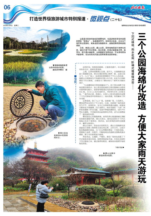 景美不湿鞋   日前,南溪山公园、虞山公园、园林植物园进行海绵化改造,通过打造下凹式绿地、雨水花园、阶梯式植被缓冲带、植草沟,进行透水铺装等,公园面貌正悄然改变,不仅景观更加丰富多样,也为市民雨天逛公园带来更优质的体验。